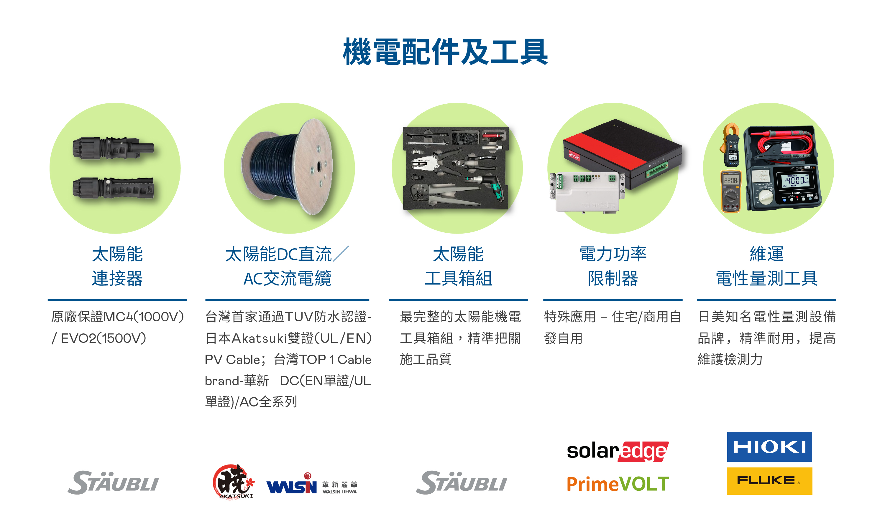 在「一站式購足」服務範疇下,友達除自有太陽能模組及監控監控軟硬體整合方案外, 同時提供客戶太陽能電廠其它的可靠優質零組件品牌與產品,包含電廠的重要組件如變流器、連接器、電線電纜、環境偵測裝置及相關輔佐材料與工具。