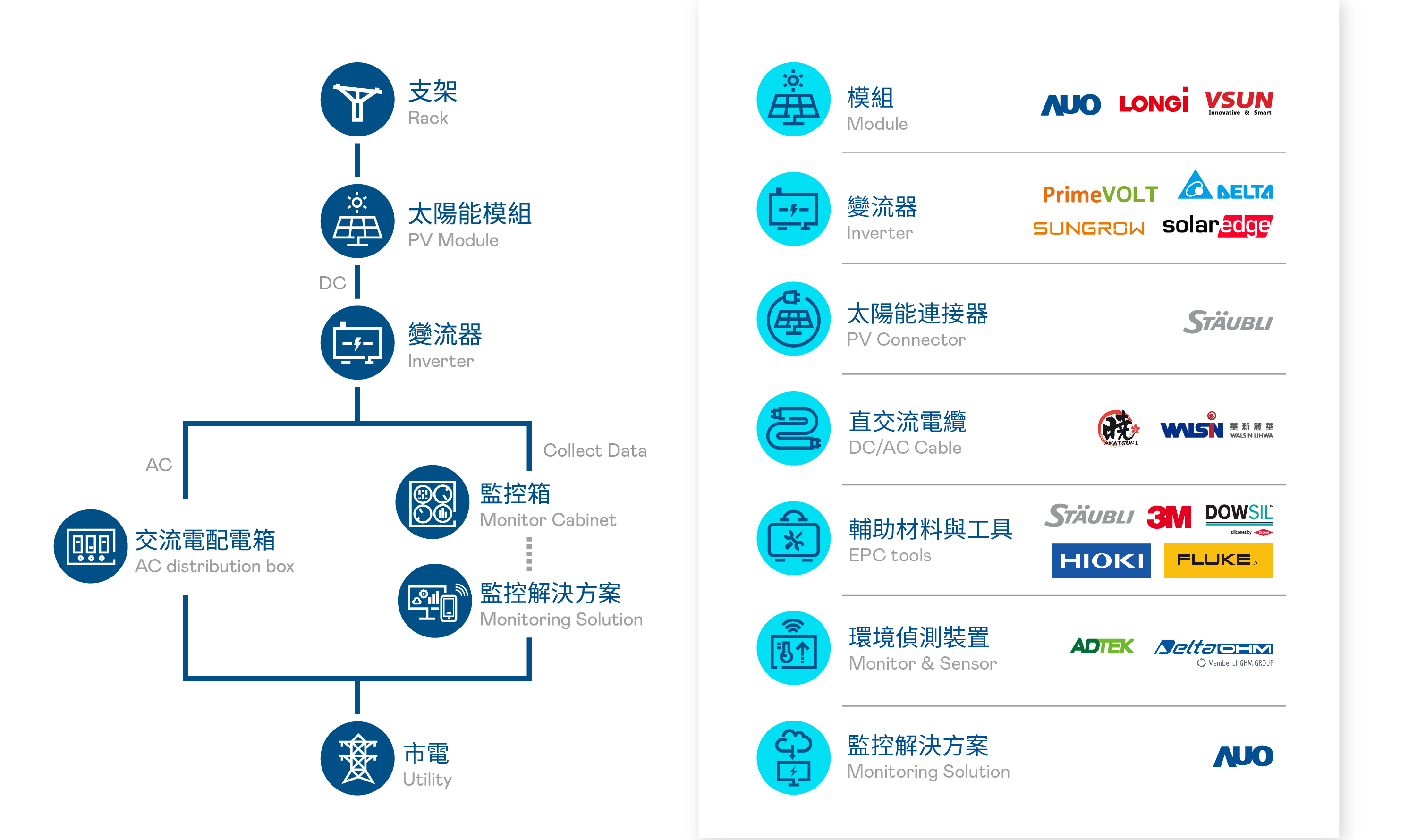 在「一站式購足」服務範疇下,友達與國內外知名夥伴合作,整合了高效能太陽能模組、監控軟硬體解決方案、變流器、太陽能連接器、 太陽能電線電纜、環境偵測裝置及相關輔佐材料與工具等太陽能電廠之零組件產品,提供客戶線上線下全通路服務。